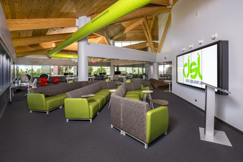 The now-signature green walls were inspired by an airport Dr. Wastawy visited in Ireland. She noticed how a particular section in the airport attracted passengers simply by using the vibrant color and comfortable seating. The textile and fiber artwork decorating the DSL was carefully selected and specially commissioned from an Orlando artist, bringing energy and originality to the space. Even the Library’s iDesk was redesigned to better connect staff and students.