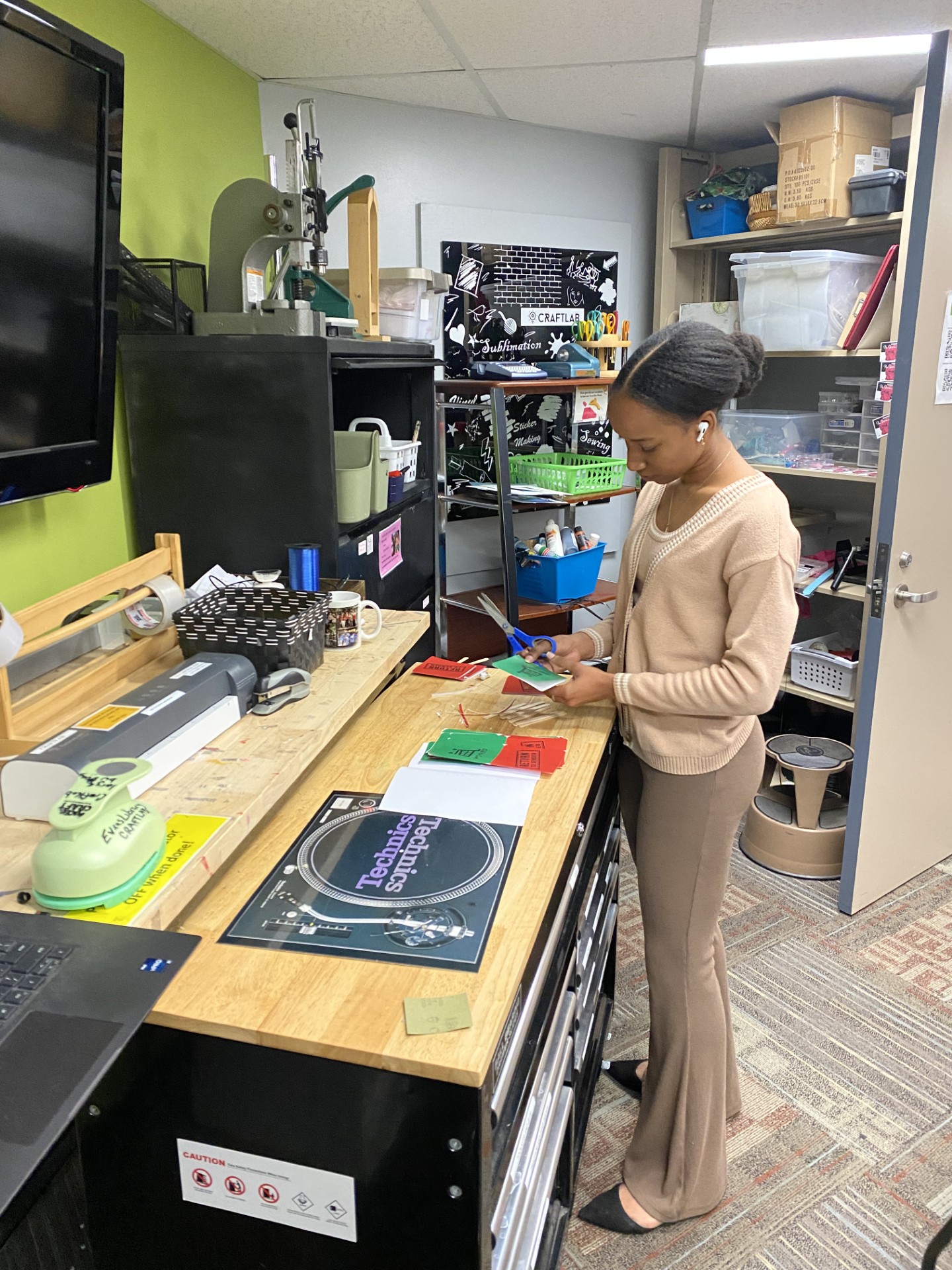 A senior in Computer Science, Chervelle Pierre, uses the CraftLab frequently for personal projects like handmade cards and small creative projects. “For me, it’s a way to balance my academics,” she explained. “My major doesn’t really allow me to use my creative side. The CraftLab gives me a creative outlet. It helps me use the other side of my brain—not the technical side, so a more holistic approach to life.”