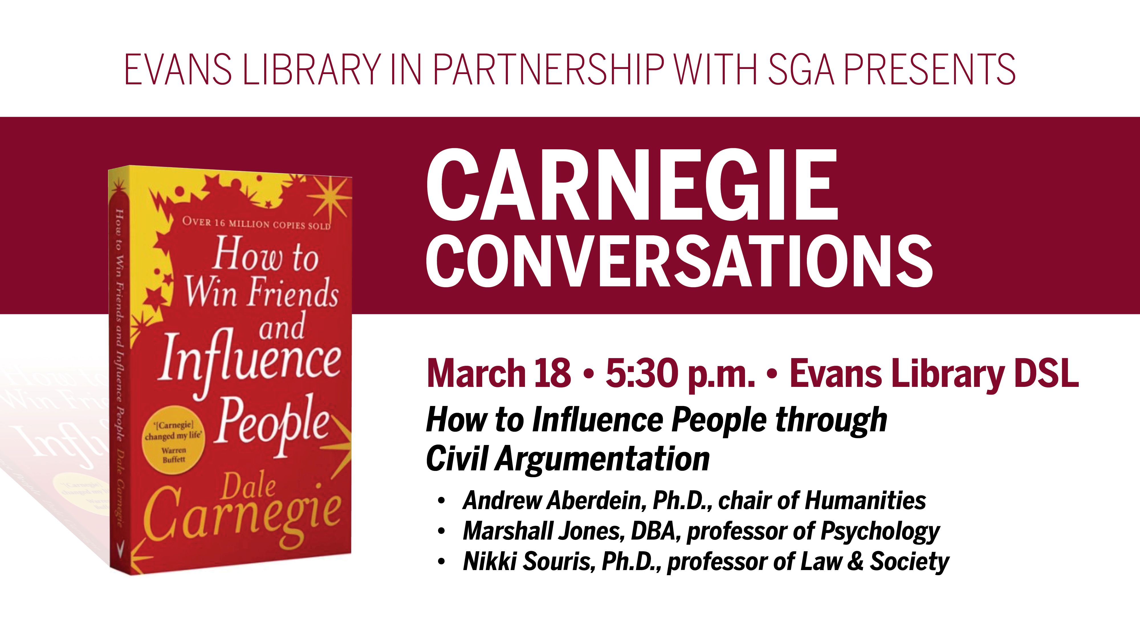 On Wednesday 18 March, the Evans Library held its second of two programs on Dale Carnegie's classic book How to Win Friends and Influence People. You can read about our first program Communicating to Win here. The library partnered with SGA who purchased over 100 copies of the book to distribute to Florida Tech students, who took them all in only a few days. In addition, the Evans Library organized two panel discussions on the book's principles. The second of which How to Influence People through Civil Argumentation featured Dr. Andrew Aberdein, Professor of Philosophy and Chair of Humanities Programs at Florida Tech; Dr. Marshall Jones, former law enforcement officer and Director of the Center for Applied Criminal Case Analysis at Florida Tech; and Dr. Nikki Souris Associate Professor of Law & Society and Pre-Law Advisor in the School of Arts & Communications. The panel discussed using Carnegie's principles to engage in civil discourse with others, especially those with whom we disagree.